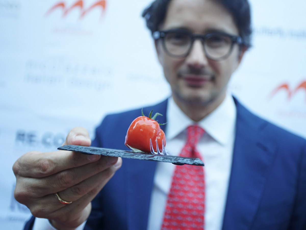 Il critico Tiziano Panconi mostra come un opera d'arte la nostra tartare di gambero nel pomodoro ricostruito.
